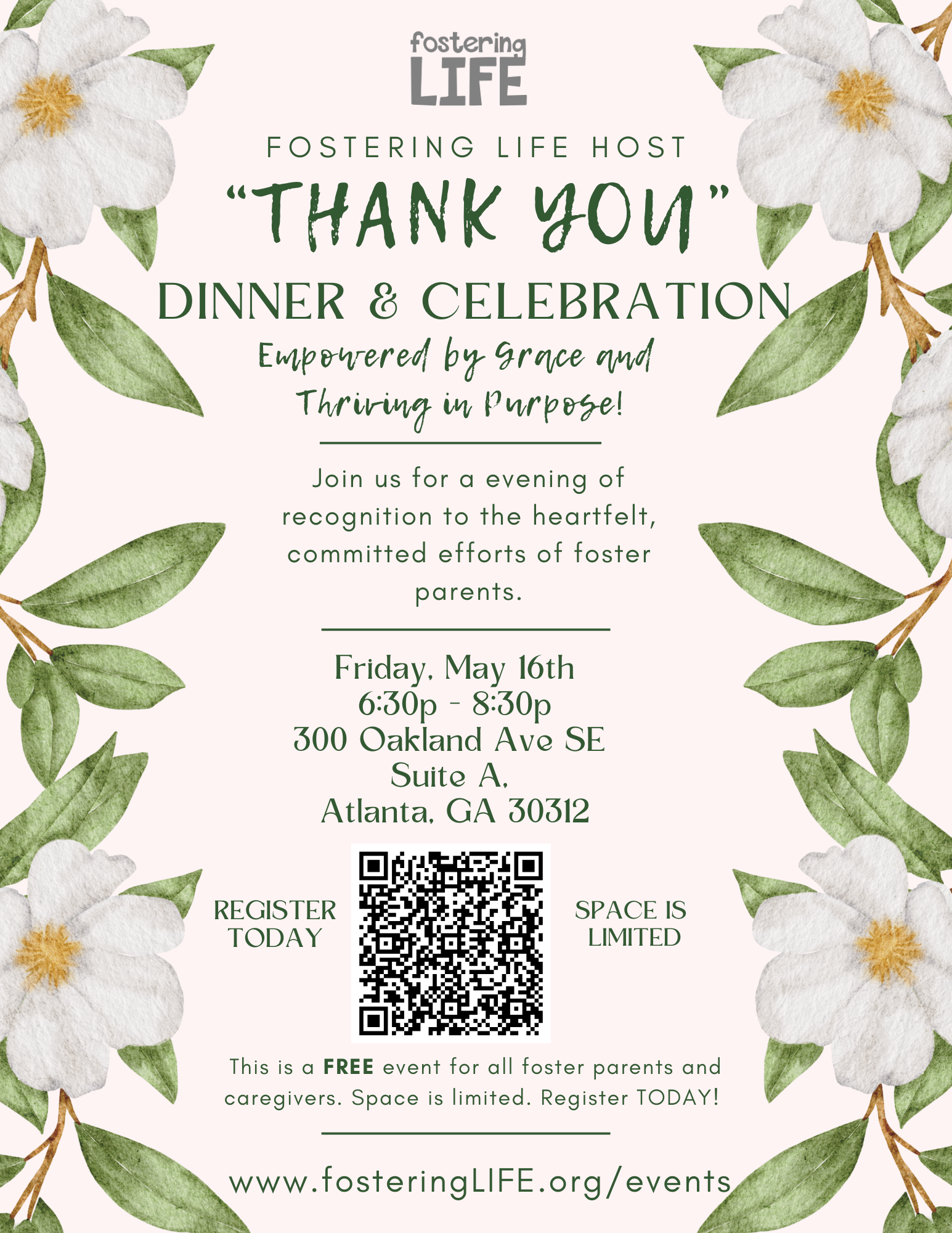 Join us as we celebrate the unwavering love, resilience, and dedication of our foster parents at the Foster Parent Thank You Dinner. This special evening is a time to honor those who have helped children flourish, even through life’s most challenging seasons. This is a free event for all foster parents and plenty of recognition gifts.