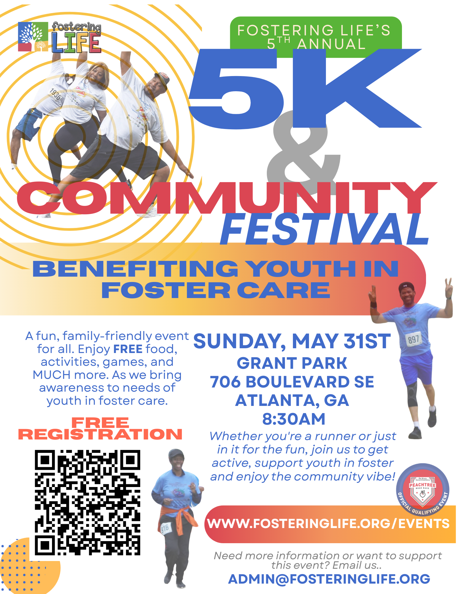 The Fostering LIFE 5K & Community Festival is a certified 5K run and family-friendly walk held during National Foster Care Month to raise awareness about the state of foster care in Georgia and the critical needs of youth in care and the caregivers who support them.